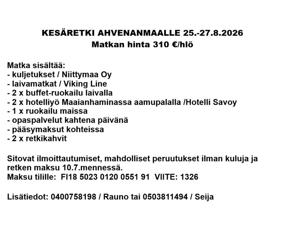 Sitovat ilmoittautumiset 10.4. mennessä Liisalle p. 044 2923447
